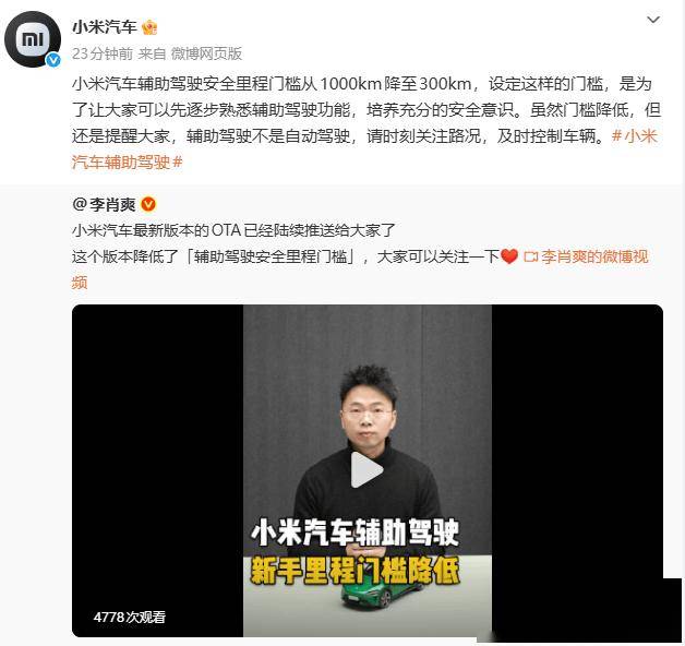 小米汽车近日告示,对旗下车辆援手驾驶功能的使用条目作出紧迫退换,将用户解锁该功能的驱动安全里程要求从1000公里大幅下调至300公里。这一变动通过最新OTA系统更新向用户推送,旨在让更多车主或者更早体验智能驾驶援手系统领来的便利。 据官方诠释,此前设定的1000公里安全里程门槛,本意是匡助用户逐步熟习援手驾驶特色并开拓安全操立场俗。这次退换后,系统仍涌现过渐进式训导表情,在用户使用经由中合手续强化安全驾驶意志。公司终点强调,尊龙app面前时间仍属于L2级援手驾驶范围,驾驶员必须保合手对车辆和路况的及时监控,随时准备继承限度权。 {jz:field.toptypename/}这次系统更新除退换安全里程门槛外,还对援手驾驶功能的交互界面进行了优化,新增了多项安全教唆功能。更新包正通过分批次表情向总计适配车型推送,用户可在车辆诞生中搜检更新情景。时间团队暗意,后续将合手续汇注用户反映,凭证骨子使用情况对功能参数进行径态优化。 |