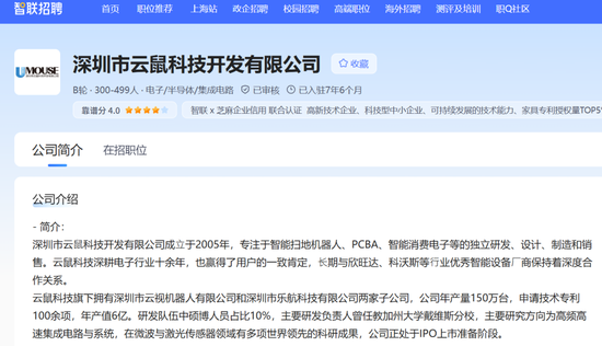 (开首:智联招聘网,“资市会”截图) 另据知道,云鼠科技年产扫地机器东说念主150万台,苦求时期专利100余项,年产值6亿元,主要商量目的为高频高速集成电路与系统,在微波与激光传感器领域有多项世界最初的科研收尾。 智联招聘平台信息知道,云鼠科技正处于IPO上市准备阶段。 天眼查知道,OPPO广东转移通讯为云鼠科技第三大股东,捏股14.2755%;苏州步步高为捏股5%的第五大股东。