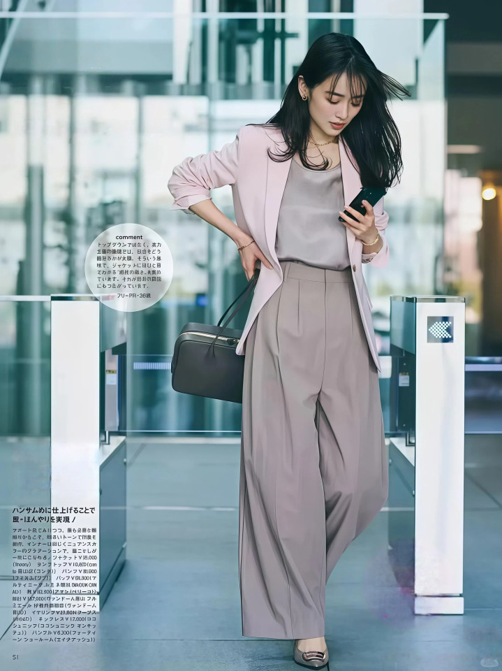★ 通勤选浅口单鞋配高腰西裤,上衣塞腰后突显身体比例 通勤穿搭里浅口单鞋配高腰西裤,是很值得你去尝试的一组搭法,上衣塞进裤腰之后腰线位置上移了,下半身从腰到脚拉出了填塞长的纵向距离。 浅口单鞋鞋口低、鞋底薄,不会在眼下加多任何过剩的体量,整套搭配的重点天然落在你的腰线和上身,眼下干净陋劣就够了。