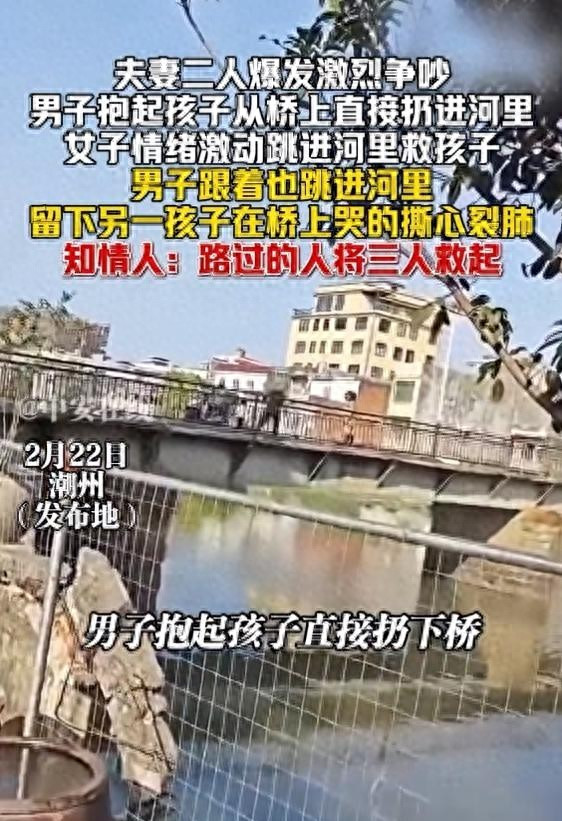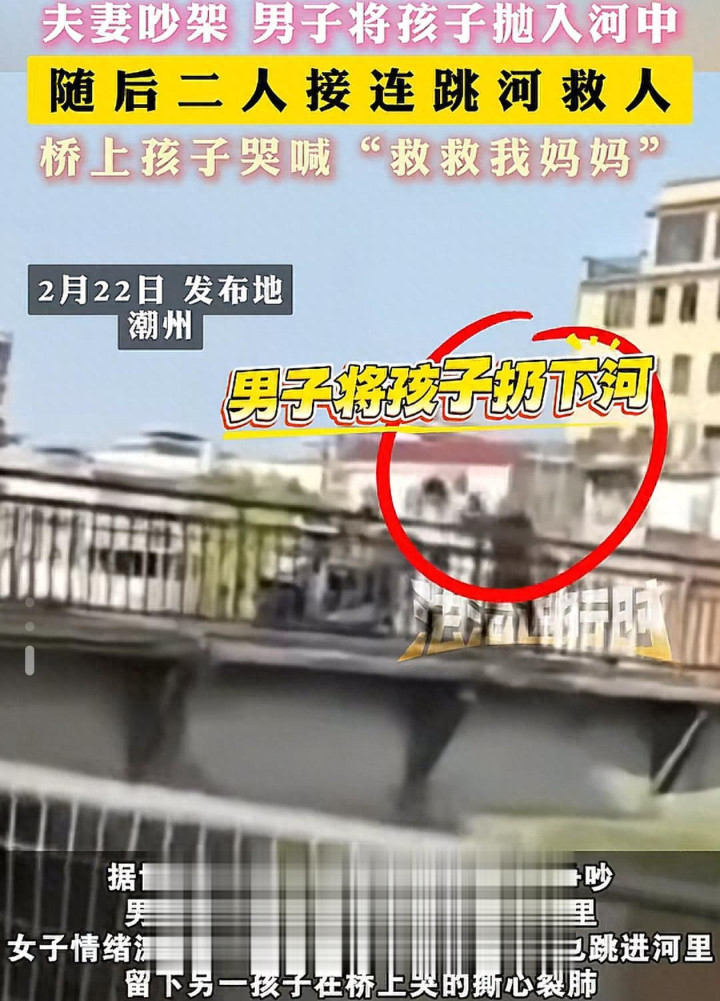 那天是2月22号,潮州一座老桥,天气可以,阳光晒着有点暖。两口子带着两个小孩骑电动车过桥,大的四岁,小的才两岁多,齐坐在后座上。没东说念主知说念为啥吵起来,但声息越来越大,接着就推搡,四肢越来越急。 {jz:field.toptypename/}桥不宽,雕栏也庸俗,不是那种尽头高的。监控拍到须眉骤然回身,把小的阿谁抱起接触前一倾,东说念主就翻夙昔了。不是甩,也不是扔,等于抱得太紧又站不稳,所有这个词这个词东说念主往前栽。水花不大,掉下去那一下很轻,轻得让东说念主反映不外来。 女的喊了一声,径直从桥边跳下去。三秒钟,没徬徨。她落水的位置比孩子偏了少许,游夙昔抱起小孩时,水仍是没过孩子脖子。她用手托着孩子的脸,让嘴巴鼻子露在水面上,只撑了半分钟,手就运行抖。
